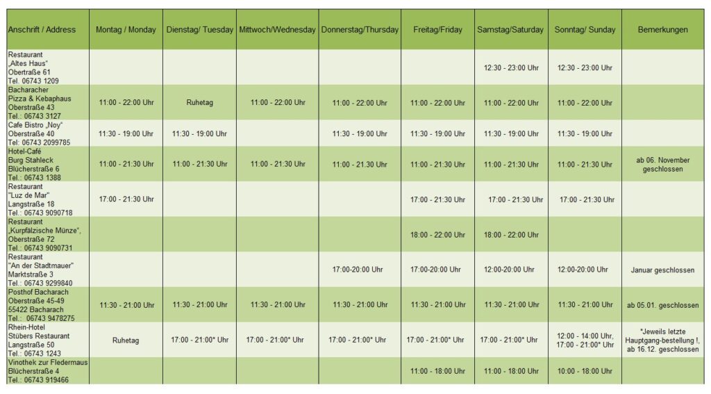 Geöffnete Bacharacher Gastronomiebetriebe Nebensaison 2025/2026