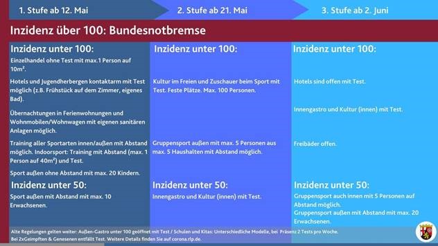 Die Landesregierung Rheinland-Pfalz hat nach langen Monaten des Lockdowns Öffnungsschritte für Gaststätten- und Beherbergungsbetreibe beschlossen. So sind vorsichtige Lockerungen geplant für Kommunen in Rheinland-Pfalz, die fünf Werktage in Folge eine Inzidenz von unter 100 aufweisen und in denen die Bundesnotbremse nicht greift. Die Lockerungen erfolgen in 3 Stufen.